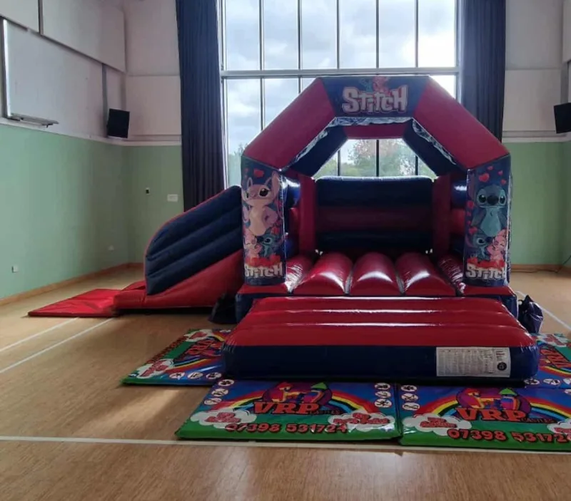 Introducing the vibrant VRP Castles Red and Blue Bouncy Castle with side slide, an exciting experience perfect for children's parties and family gatherings! Adorned with our whimsical Lilo & Stitch artwork, this bouncy castle brings a touch of Disney magic to any event, captivating the imaginations of kids and creating fun-filled memories.