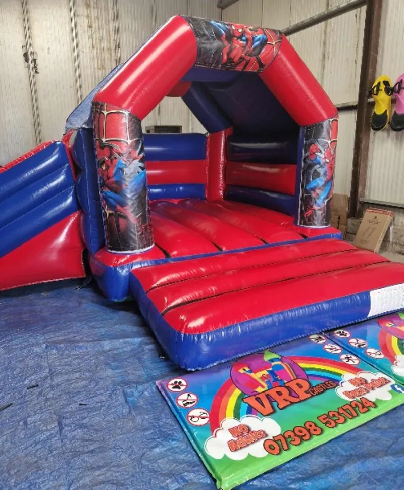 Get ready to swing into excitement with VRP Castles' Spider-Man-themed Red and Blue Bouncy Castle featuring an exhilarating side slide! Perfect for young web-slingers and fans of the iconic superhero, this vibrant inflatable brings the thrill of Spider-Man's adventures to your event. Whether it's a birthday celebration, school gathering, or any special occasion, this bouncy castle will have kids jumping for joy!